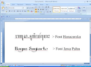 - Setting selesai dan untuk menulis aksara Jawa seperti menulis aksara latin, yaitu buka Microsoft Word pilih Font hanacaraka dan ketik seperti biasa. Hasil yang dihasilkan sudah aksara Jawa.