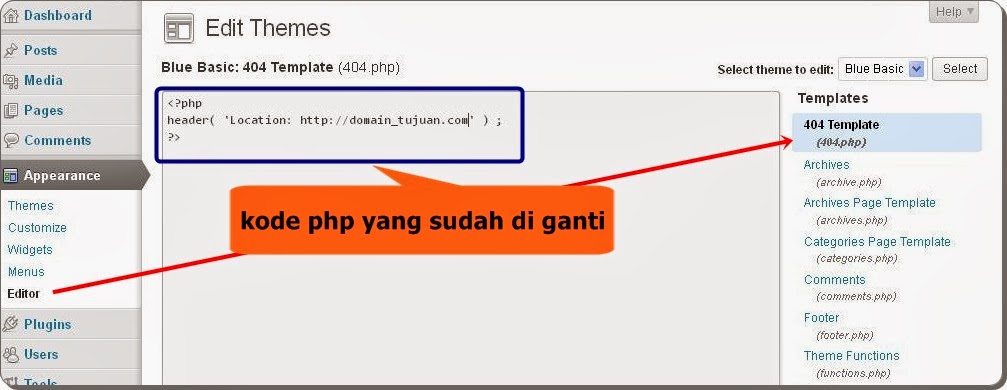 - Perhatikan kolom disebelah kanan, cari 404 template hapus dan ganti apa yang ada disitu yang berupa kode php.