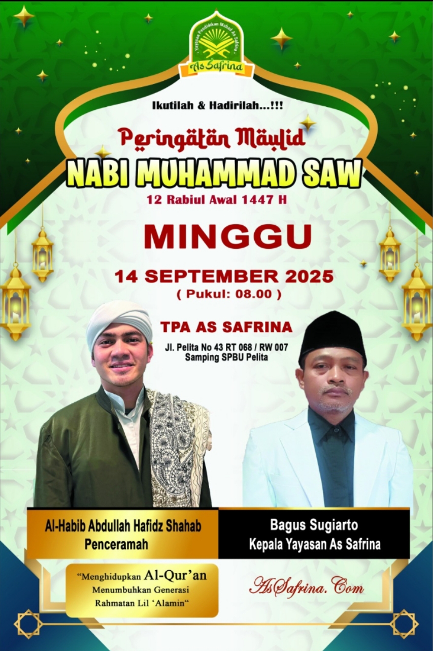 Kotawaringin Timur – Acara akbar Khataman Al-Qur’an dan Maulid Nabi Muhammad SAW di Lembaga Pendidikan Al-Qur’an (LPQ) As Safrina berlangsung meriah dan penuh haru pada Minggu (14/09/2025). Sebanyak 22 santri, terdiri dari 14 putra dan 8 putri, berhasil menyelesaikan khataman Al-Qur’an mereka sebagai bagian dari angkatan ke-6.